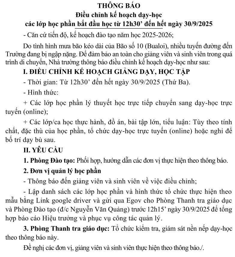 Thông báo điều chỉnh kế hoạch dạy-học các lớp học phần do ảnh hưởng mưa bão số 10